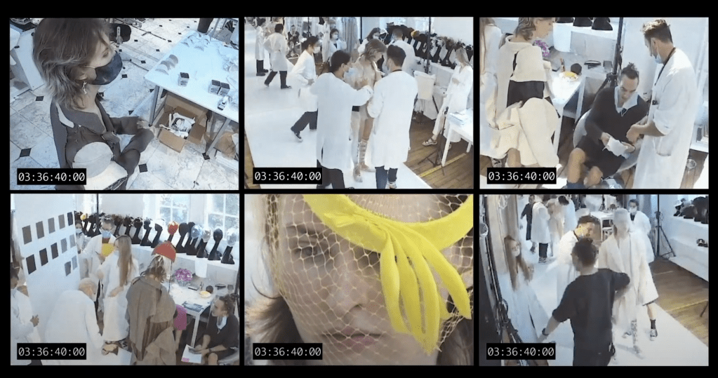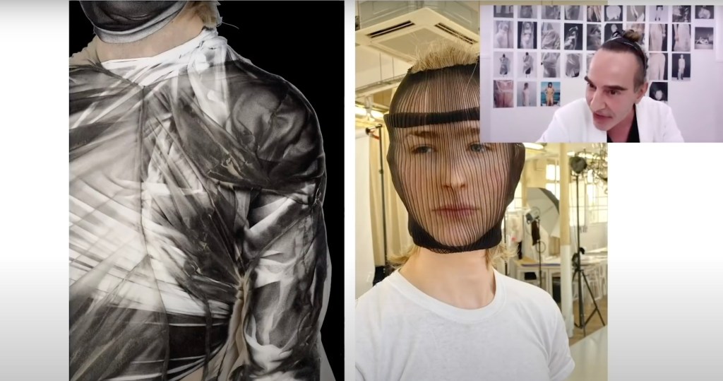 Once again proving to be the one master of modern couture, John Galliano takes us backstage in the fullest sense of the term, through his thought processes and inspirations for this latest Co-Ed Collection for Autumn-Winter 2020; an ode to the craftsmanship of the atelier, a reflection on the times, on the future of couture, infused with the timeless trope of the eternal balance between decay and beauty. Taking inspiration from classical statues in wet draped garments and the 19th century Italian trend of sculpting female figures with wet veils in Carrara marble, not to mention Galliano’s own infamous 1985 wet muslin looks, and his technique of circular cutting, the couturier sets out to recreate the impalpable folds of wet, transparent, fabric on dry materials, contrasting the softness of the transparent draping with Recicla handpicked, upcycled, vintage menswear staples like jackets and coats. Through screenshots of chatrooms and live zoom meetings we follow the multidimensional array of inspirations that informed the psychedelically hypnotic video Nick Knight has created for the Maison’s digital launch of the collection. From the hedonistic escapism of Steve Strange and the 80s Blitz kids to tragic aristocratic figures, L’Apache – the dramatic lovers’ dance of the fin de siècle- or young zoot suiters arrested for their flamboyant looks and with their clothes torn by the police, the swirling evolution of ideas from a folder of reference pictures to the toiles, the fittings, the muses, the back and forth of creativity that zigzags amongst the talents involved makes for a video that is more of an arresting documentary on the vital work of Fashion than a mere presentation of the atelier’s latest creations. An accidental glitch becomes a comment on decaying, the beauty of a decadent moment, which in turn becomes the basis for the distorted posterized images of Knight’s mesmerizing film. The movement of the models-muses influences the cuts. Technique is applied and shaped, at times forced into unparalleled feats. Galliano’s genius lies in creating from a basis of vast knowledge unhindered by fear. Artisanal, as he explains, is a laboratory, where he can discover techniques and ideas he can then adapt commercially into the main lines, it’s the Factory of The Dream, the dream you will eventually be able to buy into after he’s perfected it and made it accessible.