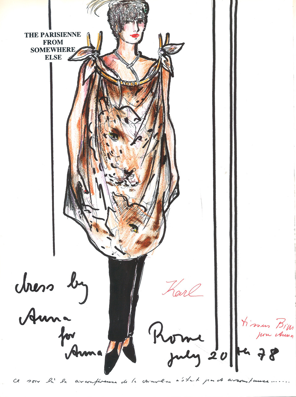 ” Anna is a graphic person… She is not pretty, she’s worse… No one knows like Anna how to endow a garment with its own visual language. She knows nothing of banality. She never does what one expects and yet it is always convincing. An unexpected detail, a tautology of style, a contradictory accessory, a surprising mixture, unforeseen associations of ideas and an indespensable touch of humour create a unique appearence …Dressing is her means of communication. .. Her vision is not necessarily that of a creator of clothing. She has no deference. She puts her mark on the creations of other people. She treats individual elements like pieces od a puzzle in order to construct an image which is unpredictable and which is hers alone. There is no imitating Anna. Those who have tried became caricatures or ” fashion victims” ” Karl Lagerfeld , Lagerfeld’s Sketchbook preface ( 1986)