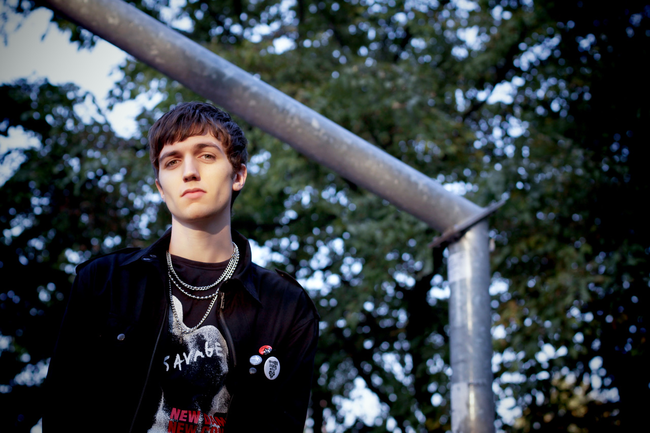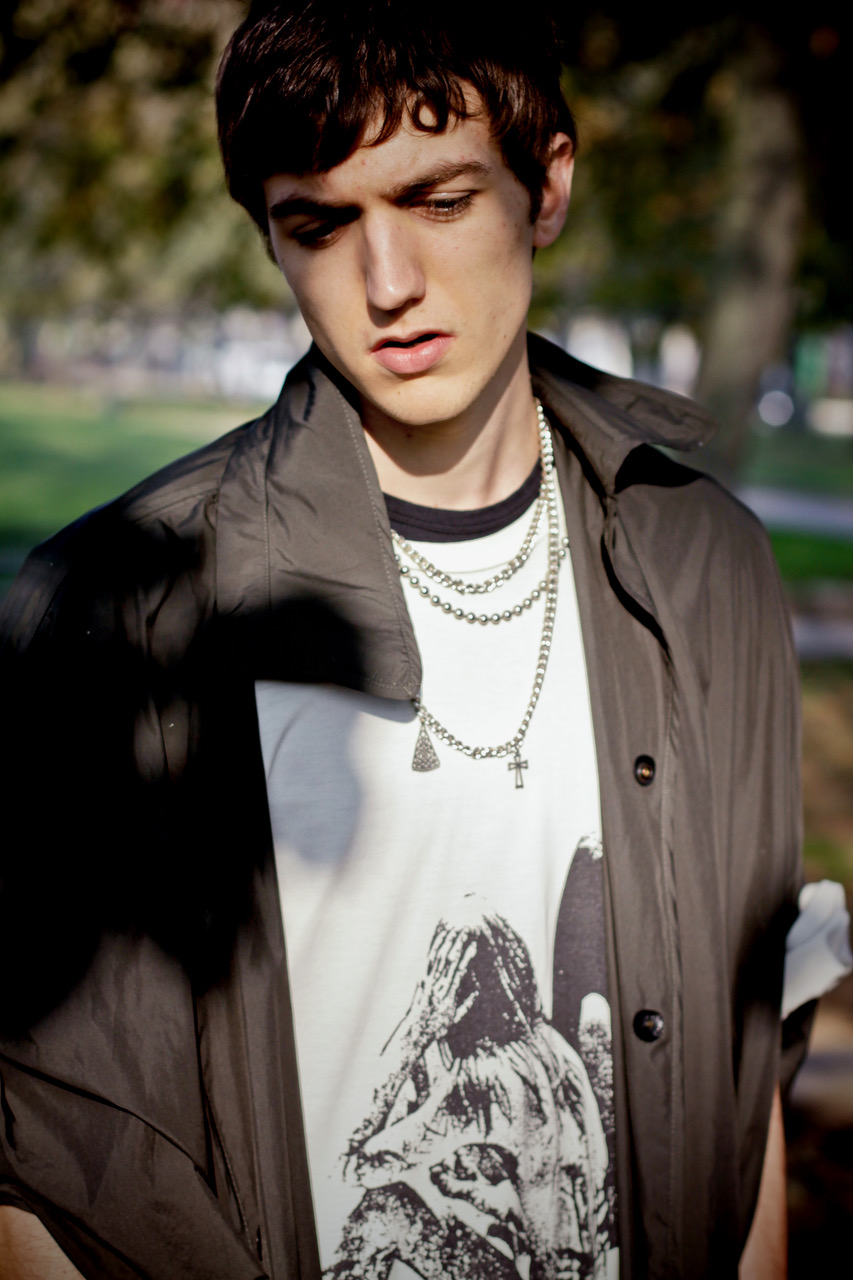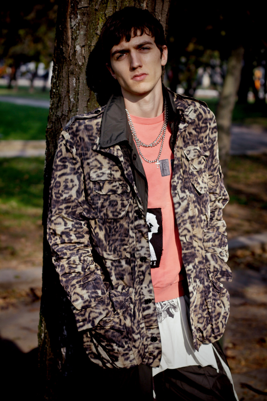 Military jacket Raf Simons FW 2005-06, tank top Raf Simons Limited Edition, skirt FW 2010-11, bondage pants FW 2002-03