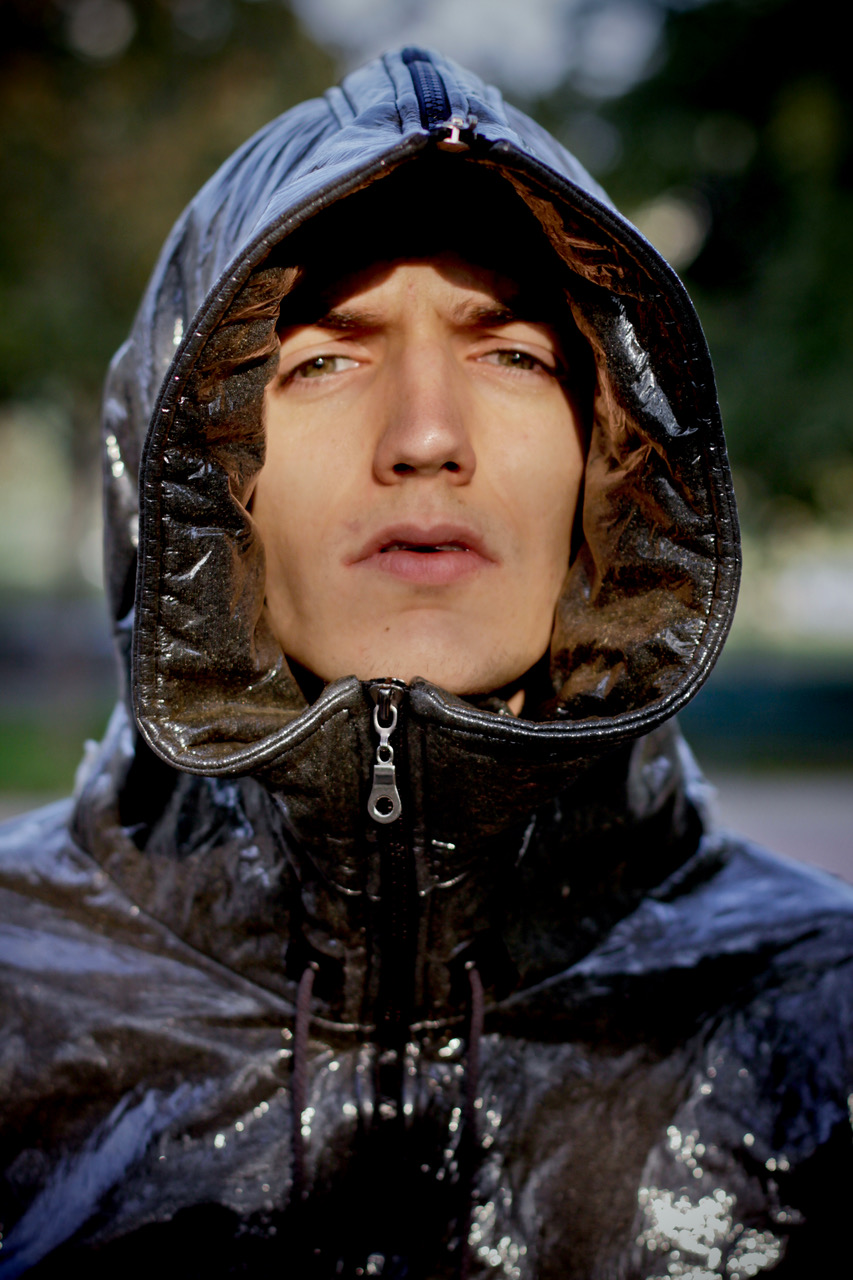 Oversize plastic trench coat Raf Simons FW 2005-06, net sweater RAF by Raf Simons, long shirt Raf Simons SS 2008