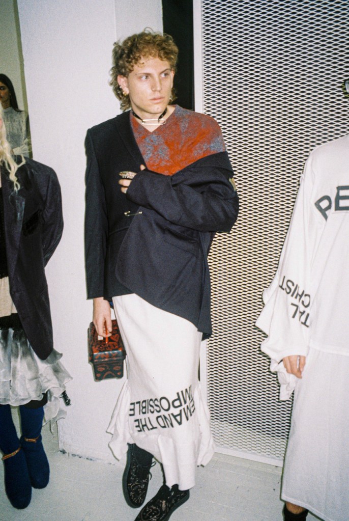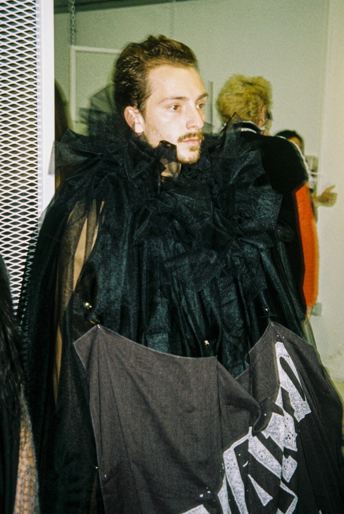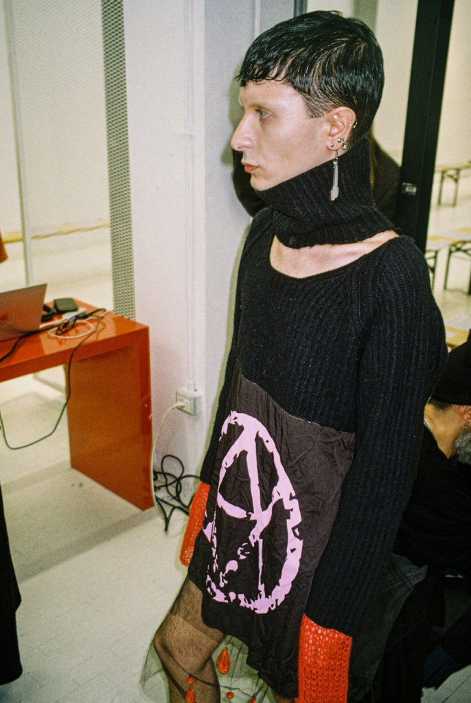 The collection is based on a strong punk ideology, in its original sense: nonconformism, the definition of one’s not aligned and unique identity , the distance from the commonplace and escape from orthodoxy, provocation and system’s mockery. All of this is reflected in tailored clothes encrusted with silicone that cracks if it’s worn, coats made from handmade blankets, knitwear that comes from leftover yarn swatches , white shirts with spray painted Peter Pan’s collars, chandelier fragments that become blood drops.