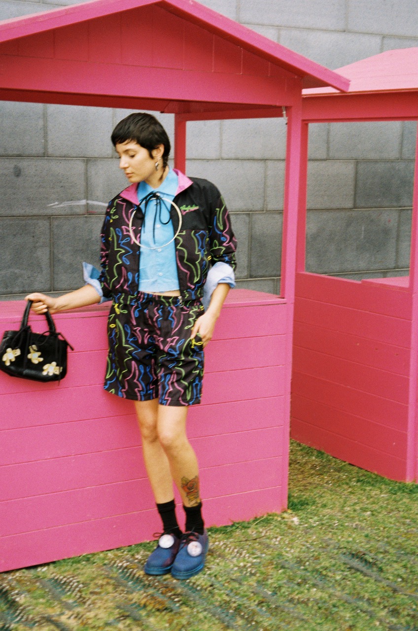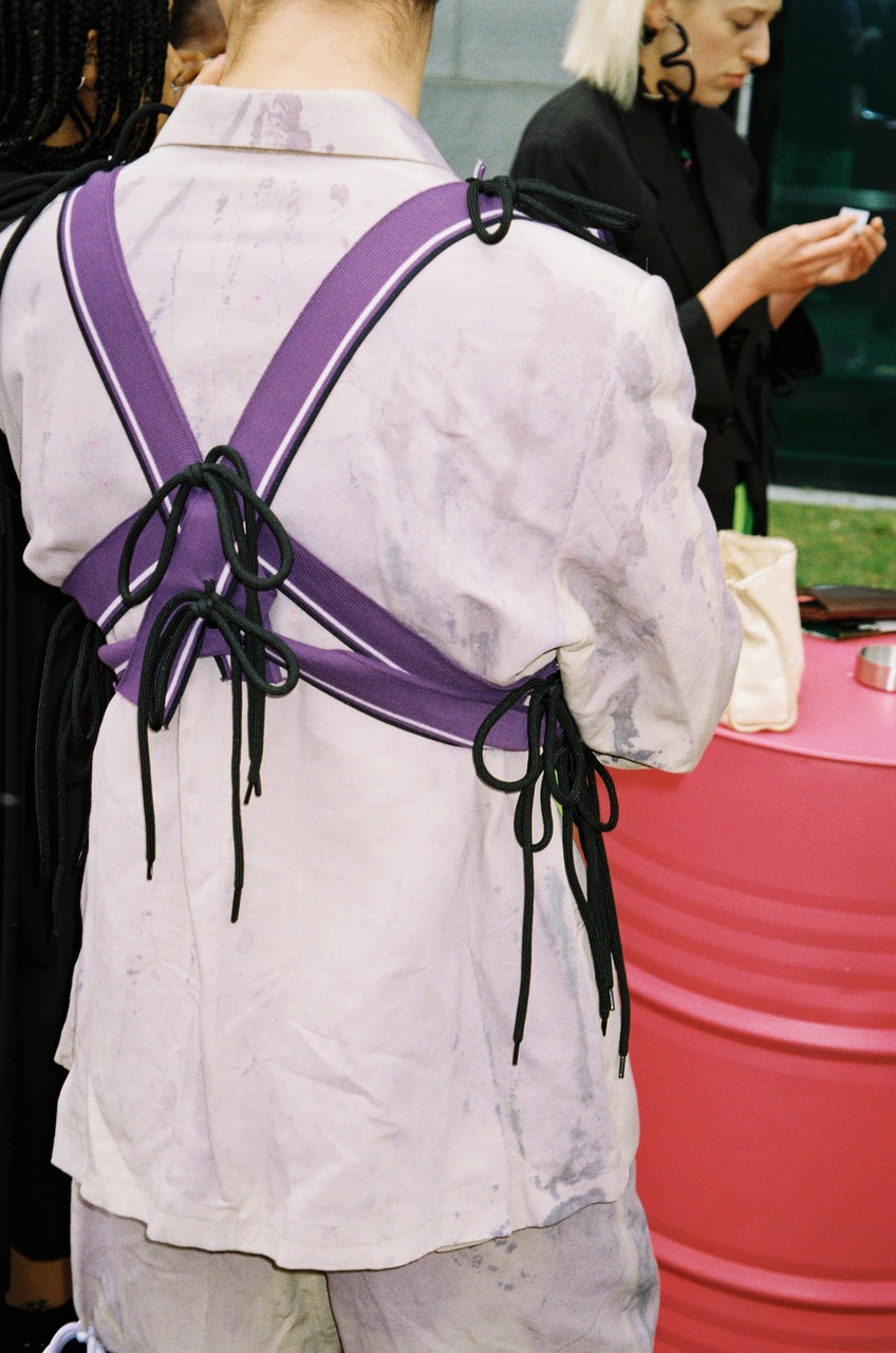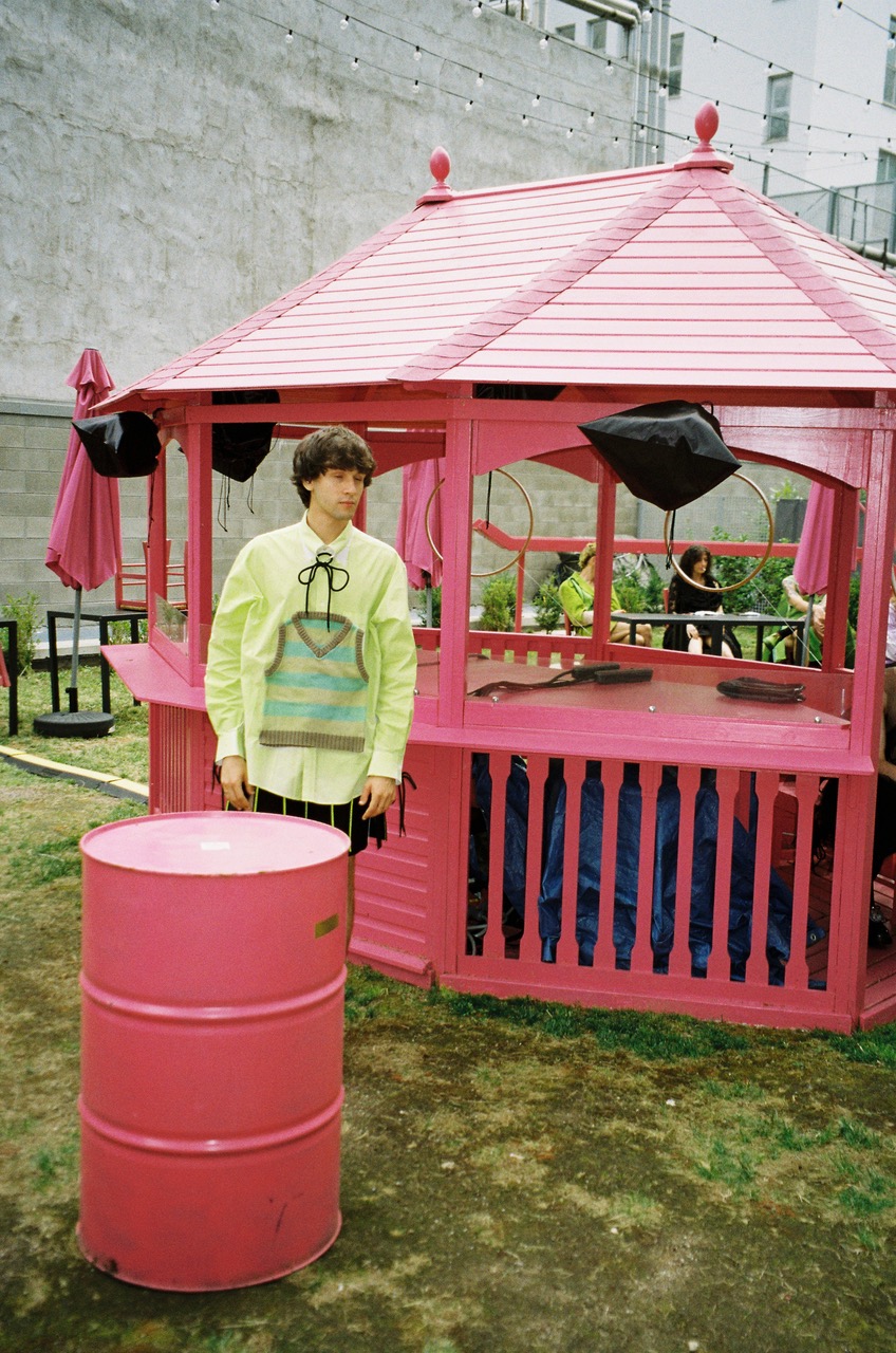 As part of the Cracker Crew and an old school Supermodel, Riccardo Slavik tried his new vintage Canon point and shoot film camera while waiting for the Cracker SS25 fashion show, taking advantage of the Alice In Wonderland-ish courtyard outside of Arca, the show’s venue. The collection’s knots, 90s tracksuits and the mix of black, lilac and neon colors were quite at home in the bubble pink furnishings of the space.