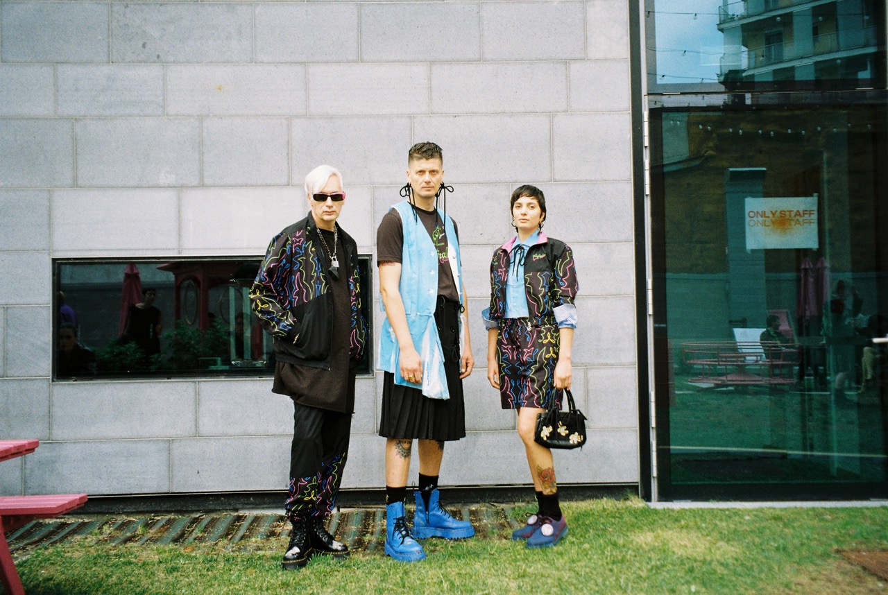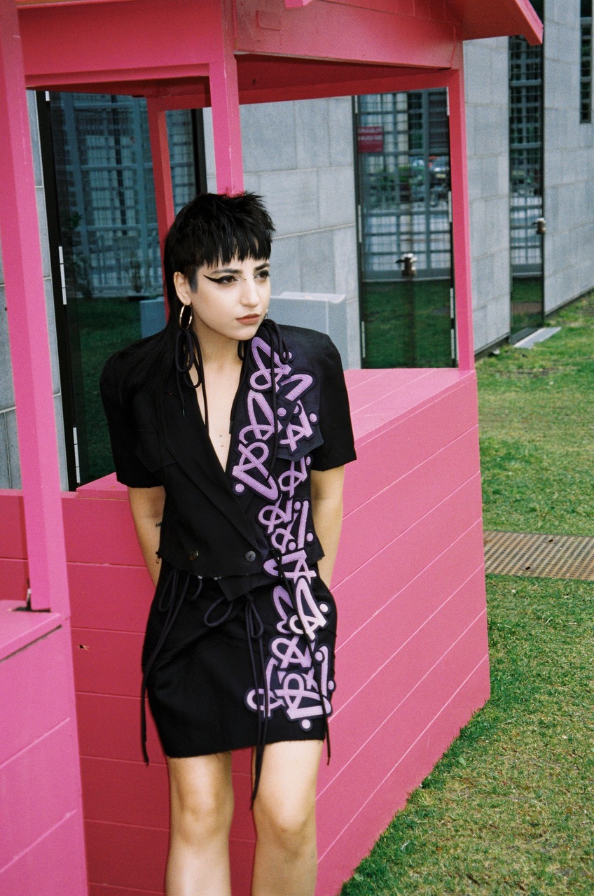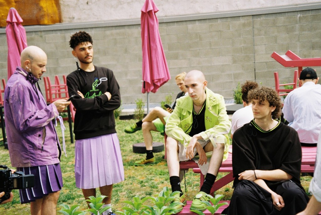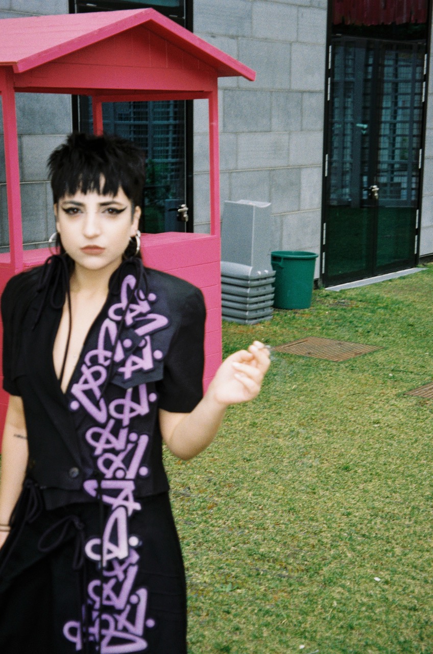 As part of the Cracker Crew and an old school Supermodel, Riccardo Slavik tried his new vintage Canon point and shoot film camera while waiting for the Cracker SS25 fashion show, taking advantage of the Alice In Wonderland-ish courtyard outside of Arca, the show’s venue. The collection’s knots, 90s tracksuits and the mix of black, lilac and neon colors were quite at home in the bubble pink furnishings of the space.